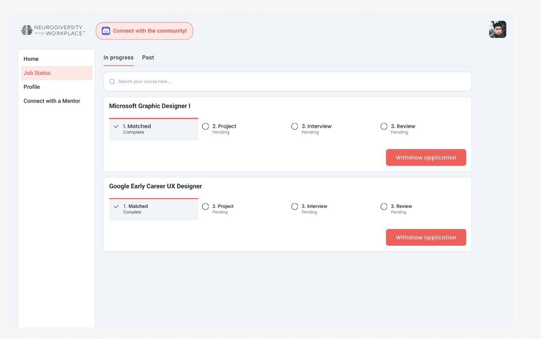 A one-stop job portal where neurodivergent job seekers can sign up to be matched, view their status updates, and access professional development resources while they wait to hear back.
