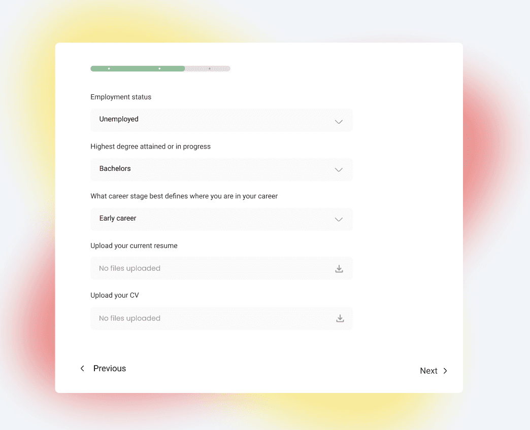 Customization of the Portal Dashboard User fills out a brief profile indicating where they are at with their job search journey— to help customize the portal dashboard resources based on the job seeker's interests. Through the portal, the user can access information about their job matching, view resources, and connect with a community on Discord.