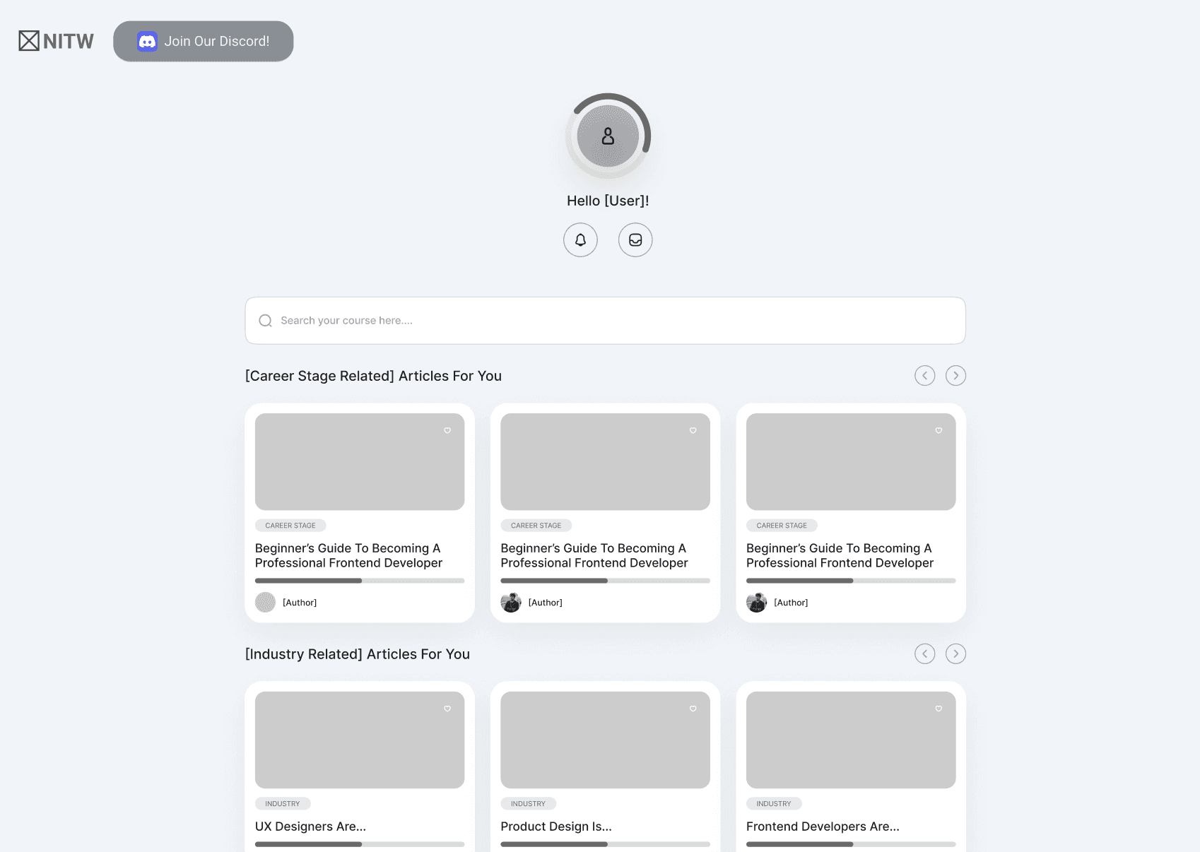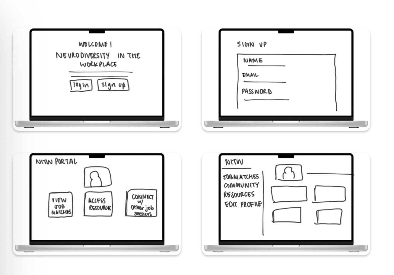 Our initial design ideas focused on an interface where users could log in and see where they're at in their job-matching journey. Currently, NITW has an intake form where a user signs up to be matched to a job in their field of interest. Our initial idea of a "login" feature was an elevated version of what the NITW website currently does. Eventually, that initial idea evolved into a more established portal that would 1) allow them to check in on their status 2) help people access resources while they wait AND 3) create a sense of community throughout the process.