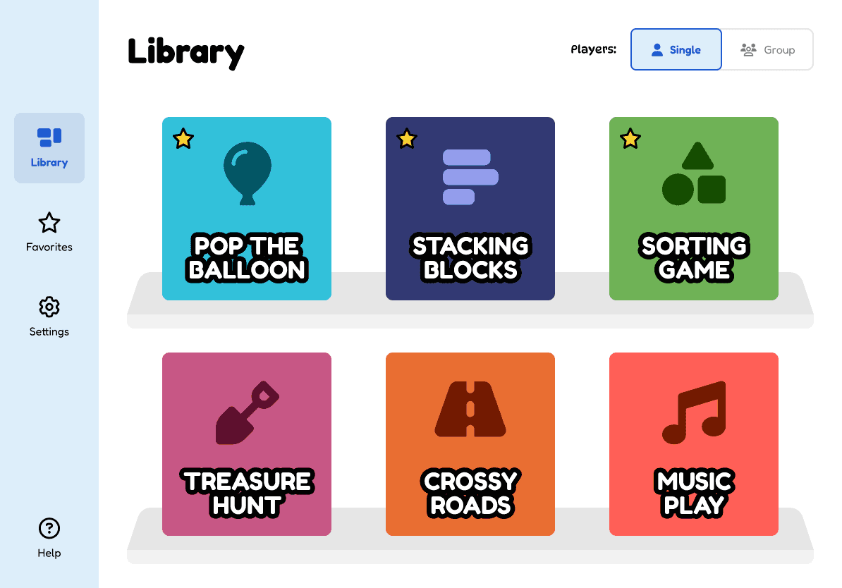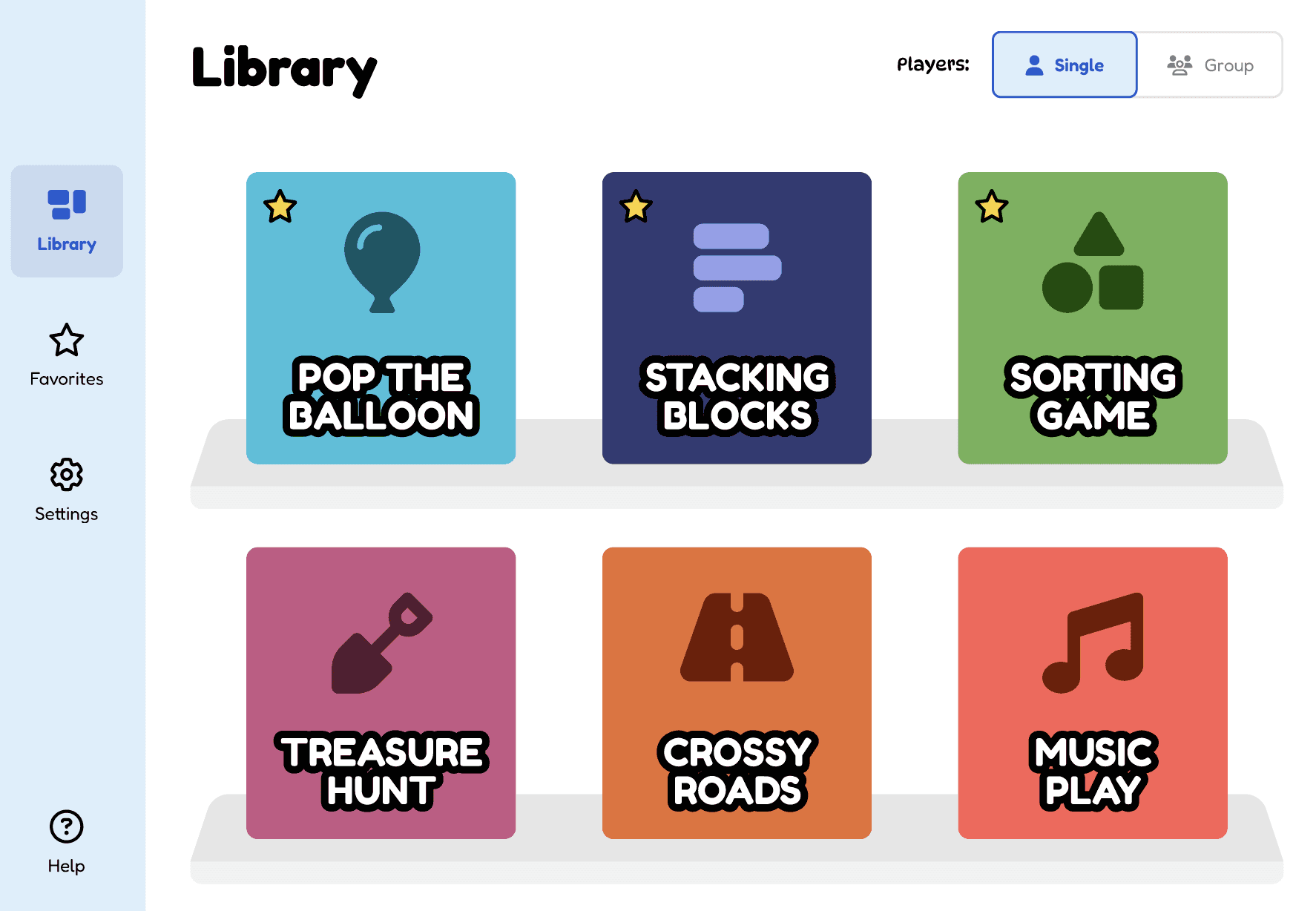 Large game tiles and icons in the library highlighting different games. Educators can favorite any games from the library. Educators can also toggle between individual and group play.