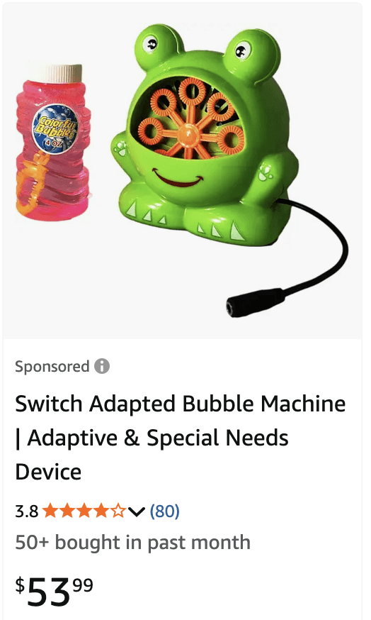 Adapted Toys: Current play solutions include adapted toys which are toys that have been modified to be played with an accessibility switch. These are significantly more expensive than their standard, off-the-shelf counterparts. Additionally, commercially available adapted toys are not widely sold in mainstream stores. They require specialized retailers.