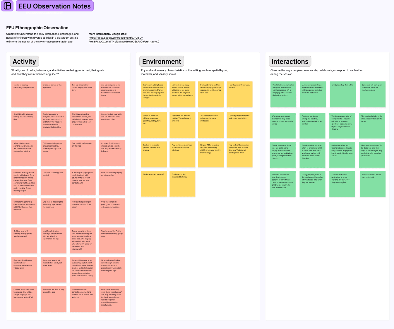 Ethnographic Observations at the EEU classrooms to understand how students currently engage in the classroom setting. We learned about how teachers used technology in the classroom, noting the existing use of iPads in the classroom.