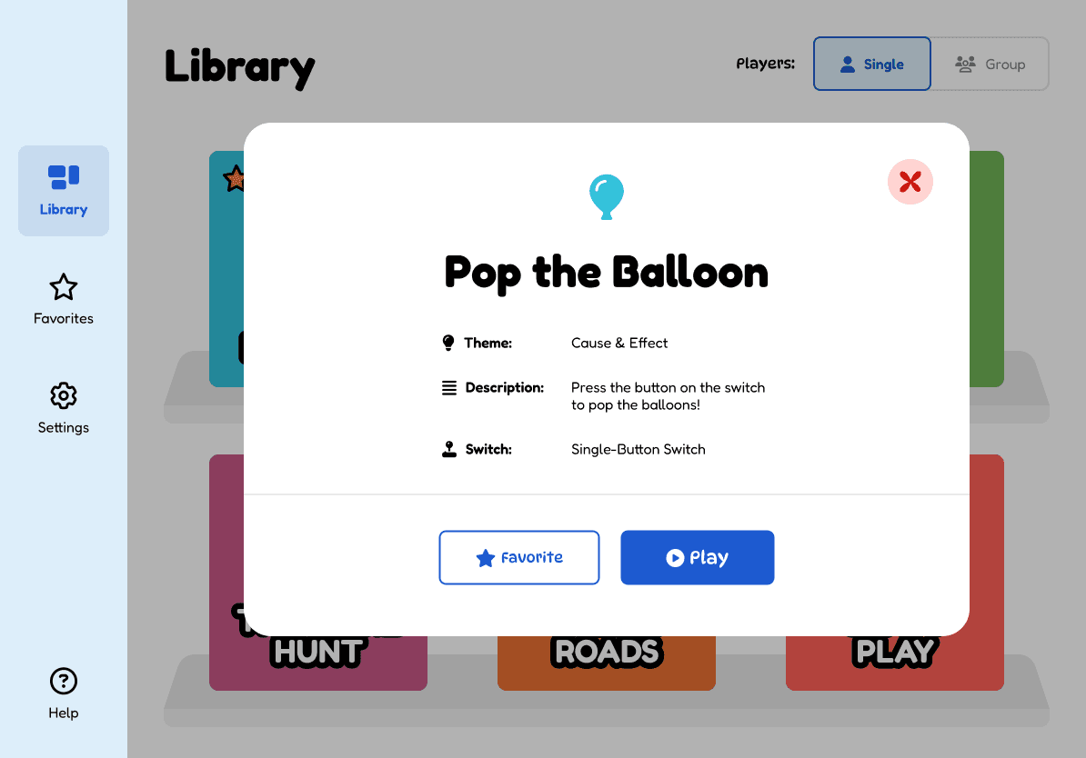 Clicking on a game will lead to a pop up that highlights the game's key themes or learning objectives. This allows educators to quickly get an idea of what the game will be like, including what switches can be accessed for the game.