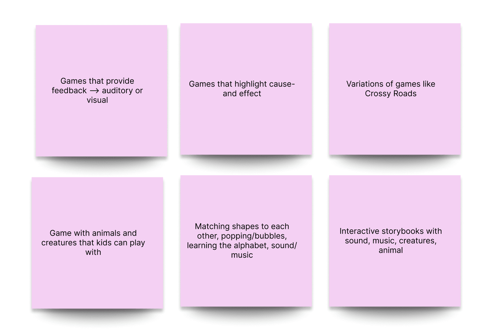 The game ideas we landed on focused on sorting different shapes, popping balloons, timing based games like Crossy Roads, and Stacking Blocks in a time constraint. Each of the games addressed different learning principles such as cause-and-effect, motor planning, and creative exploration. We first created wireframes of what these games would look like and then involved our Development Team to get their feedback on what was technically feasible.