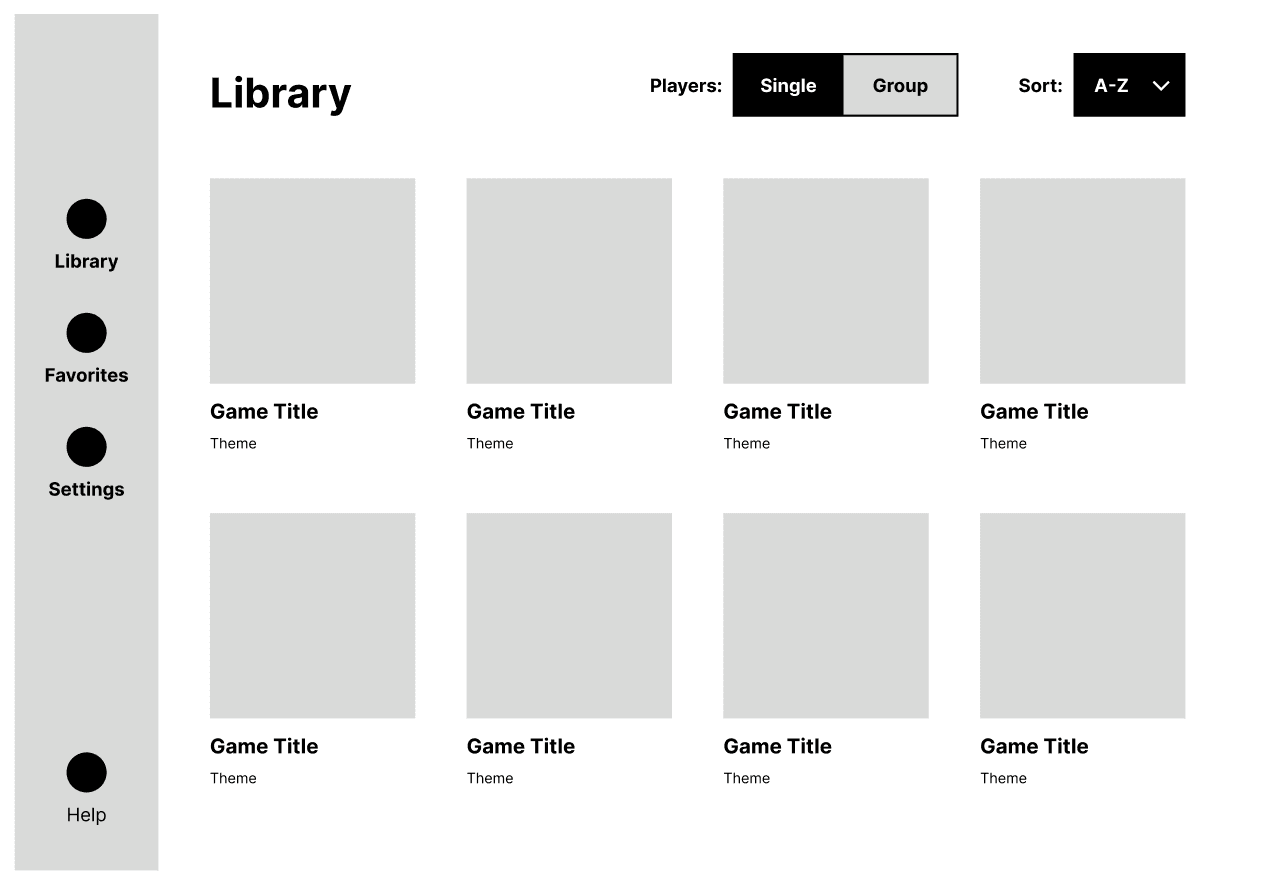 Large game tiles and icons in the library. Educators can easily navigate through the app and favorite any games from the library. Educators can also toggle between individual and group play promoting collaboration among students.
