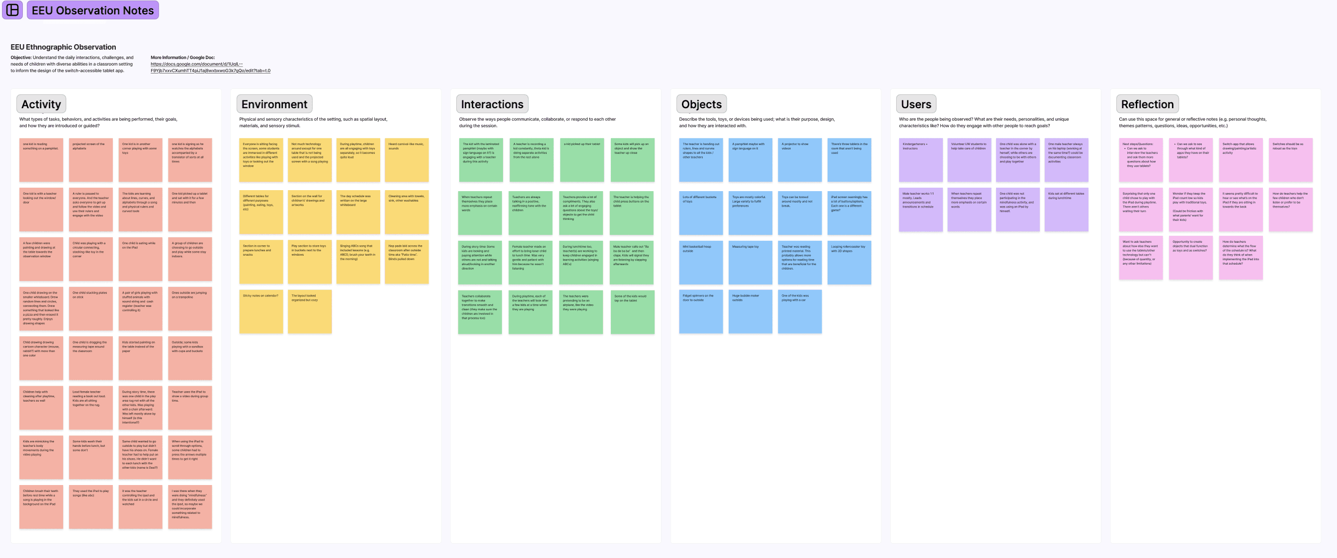 We met with educators at the Experimental Education Unit to learn about their classroom goals, and learning milestones for students. Through our interviews, we discovered that children in their classroom have diverse learning milestones. As a result, the educators seek to customize and adapt the play opportunities uniquely based on the student. Furthermore, educators emphasized that they value collaborative play opportunities for their students.